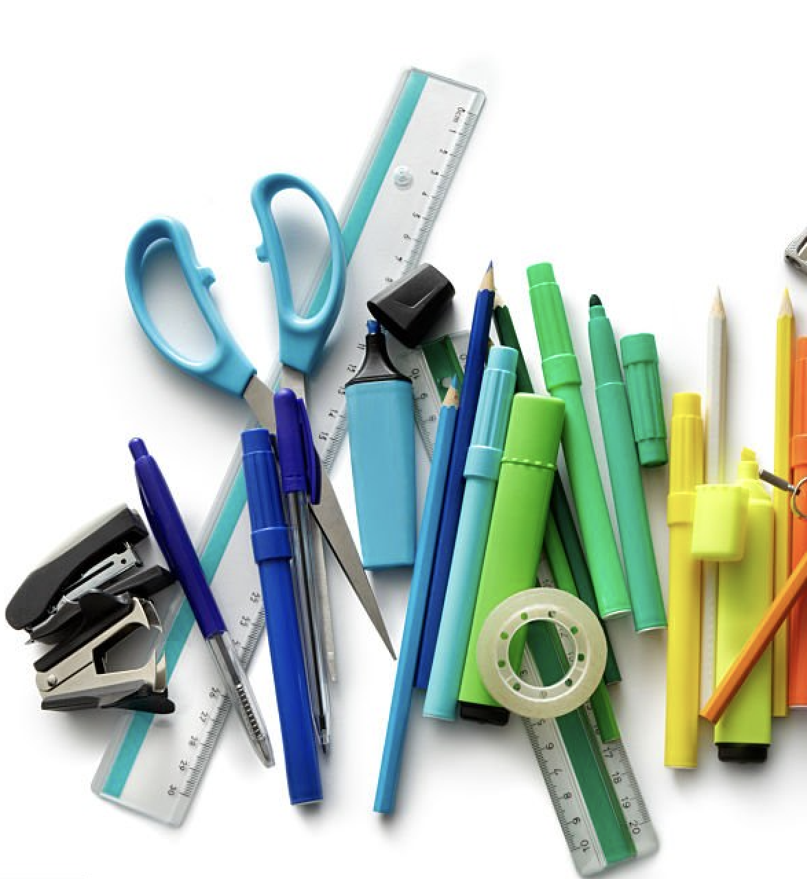 Pennen, potloden, een lineaal en al het andere dat nodig is om op school te kunnen schrijven en tekenen.